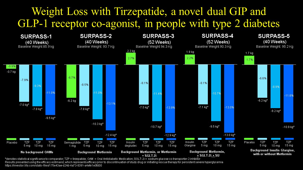 Although several GIP-GLP-1 co-agonists initially failed to impress in clinical testing, more recent data for trizepatide (originally known as LY3298176) demonstrated compelling reduction of blood glucose and body weight in both preclinical LY3298176, a novel dual GIP and GLP-1 receptor agonist for the treatment of type 2 diabetes mellitus: From discovery to clinical proof of concept Mol Metab. 2018 Dec;18:3-14. doi: 10.1016/j.molmet.2018.09.009 and clinical studies. Tirzepatide (LY3298176) is a 39 amino acid peptide based on a GIP sequence modified to include substitution of the second amino acid with aminoisobutyric acid (DPP-4 resistance) and containing a C20 unsaturated di-acid acyl chain, to enable non-covalent albumin binding and once-weekly subcutaneous dosing LY3298176, a novel dual GIP and GLP-1 receptor agonist for the treatment of type 2 diabetes mellitus: From discovery to clinical proof of concept Mol Metab. 2018 Dec;18:3-14. doi: 10.1016/j.molmet.2018.09.009 Tirzepatide exhibits comparable binding affinity and potency at the human GIPR relative to native GIP yet binds with 5-fold less affinity and is 13-fold less potent at the human GLP-1R, compared to native GLP-1 thus exhibiting bias for the GIPR. Several of the key dose rangong studies and clinical trials are highlighted here Efficacy and safety of LY3298176, a novel dual GIP and GLP-1 receptor agonist, in patients with type 2 diabetes: a randomised, placebo-controlled and active comparator-controlled phase 2 trial Lancet. 2018 Nov 17;392(10160):2180-2193. An overview of the Phase 3 Tirzepatide SURPASS program for Type 2 diabetes was presented by Eli Lilly on Nov 20 2020 and the SURPASS trials have been published highlighting the efficacy of Tirzepatide in people with T2D. The SURPASS phase 3 clinical trial program assessed the efficacy of Tirzepatide in people with type 2 diabetes. The results are summarized below, for HbA1c and weight loss