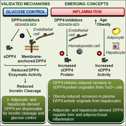 In humans, GLP-1 does not seem to activate the SNS other than transiently. However, Bharucha and colleagues infused GLP-1 into fasted non-diabetic healthy human volunteers, and observed increases in muscle sympathetic nerve activity, without changes in heart rate or blood pressure, as assessed by peroneal nerve microneurography 60 minutes after GLP-1 administration. See Effects of glucagon-like peptide-1, yohimbine, and nitrergic modulation on sympathetic and parasympathetic activity in humans Am J Physiol Regul Integr Comp Physiol. 2008 Sep;295(3):R874-80. Intriguingly, treatment of patients with type 2 diabetes with the DPP-4 inhibitorvildagliptin for 1 week, 100 mg daily, was also associated with a significant postprandial increase in plasma norepinephrine, consistent with sympathetic nervous system activation, as outlined in Dipeptidyl-peptidase-IV inhibition augments postprandial lipid mobilization and oxidation in type 2 diabetic patients J Clin Endocrinol Metab. 2009 Mar;94(3):846-52.